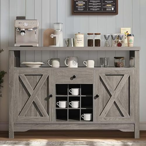 Coffee Bar Cabinet with Storage, 47” Coffee Bar Station Cabinet, Farmhouse Coffee Bar Buffet Cabinet Gray with Drawer, 9 Wine Racks, Barn Doors for Dining Room, Living Room