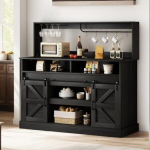 DWVO Buffet Cabinet with Storage, 52 Inch Coffee Bar Cabinet with Sliding Barn Doors, Sideboard Cabinet with Power Outlets for Kitchen, Living Room (Black Oak)