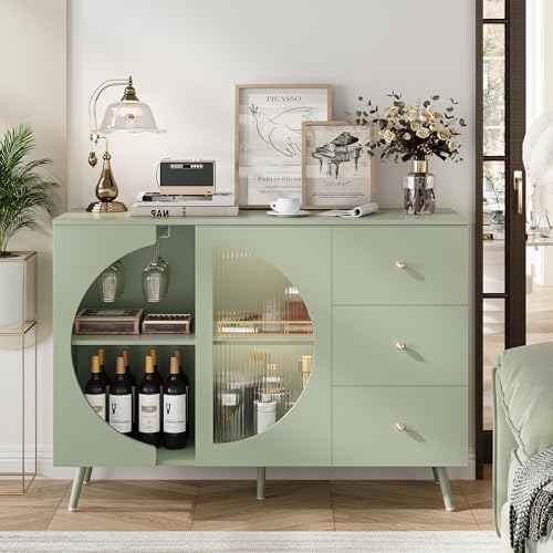 • FACBOTALL Coffee Bar Cabinet with Fluted Glass Door, Modern Cream Style Buffet Sideboard with Wine Glass Rack, Chest of Drawer Buffet Cabinet with Storage for Living Room, Green