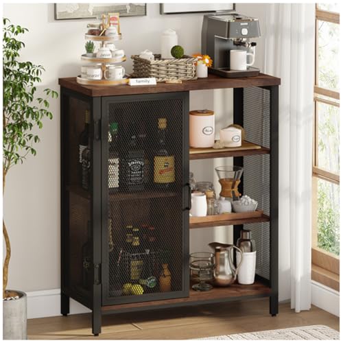 • BON AUGURE Coffee Bar Cabinet for Home Liquor, Small Storage Cabinet for Kitchen and Entryway, Farmhouse Industrial Buffet Sideboard Credenza with Adjustable Shelves (Rustic Oak)
