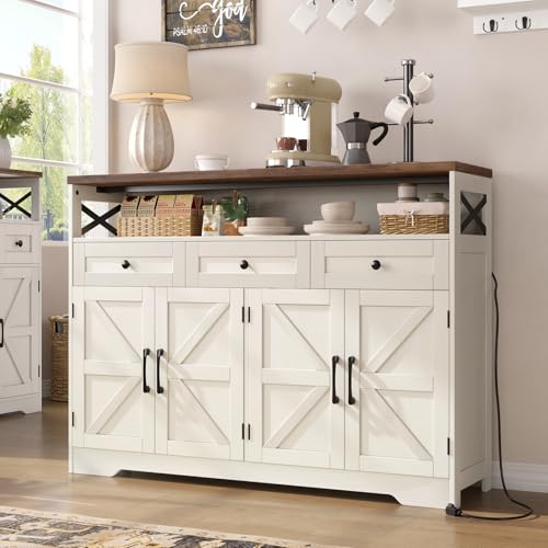 IFGET Farmhouse Buffet Cabinet, 53” Sideboard Cabinet w/3 Drawer, Rustic Storage Cabinet w/Sliding Barn Door, Coffee Bar for Dinning Room, Kitchen, Hallway, and Living Room, White