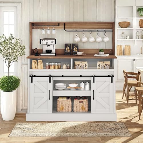 YITAHOME Farmhouse Buffet Cabinets with Storage, 47″ Coffee Bar with Goblet Holder & Power Outlet, Sideboard Cabinets with Sliding Barn Doors for Kitchen, Living Room (White + Walnut)